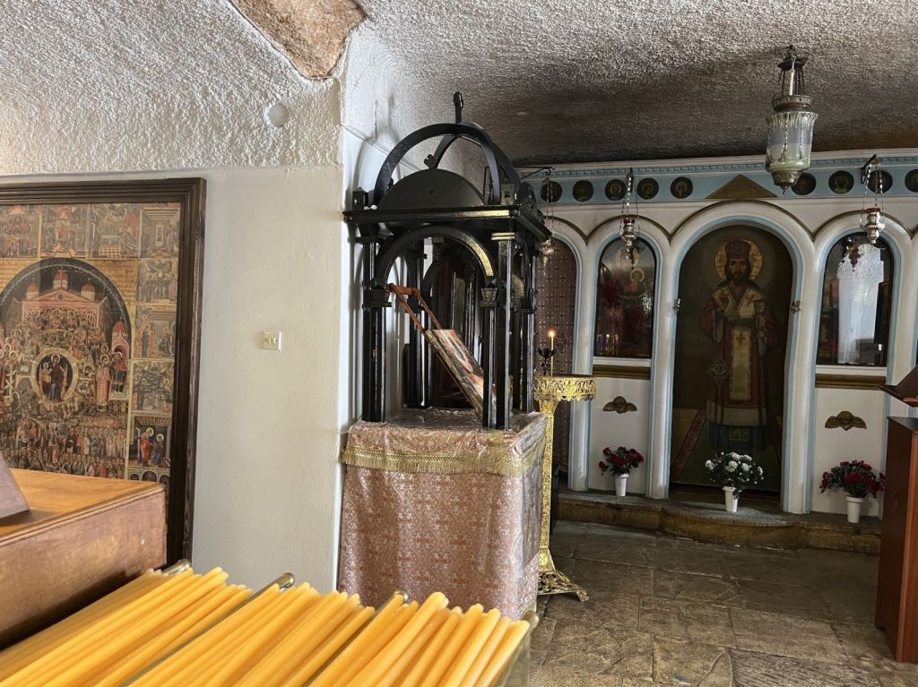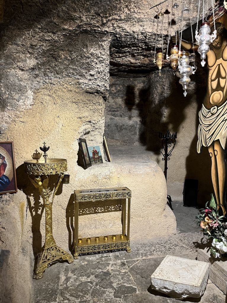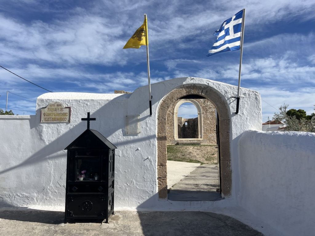 Outside the main town, a wonderful find is the Catacomb Church of Faneromenis. Surrounded by pine trees, the upper Byzantine church stands in atmospheric ruins. Below it, a whitewashed cave chapel filled with candles and icons opens into early Christian catacombs – stone-cut chambers pierced by a shaft of daylight from a hole at the top.