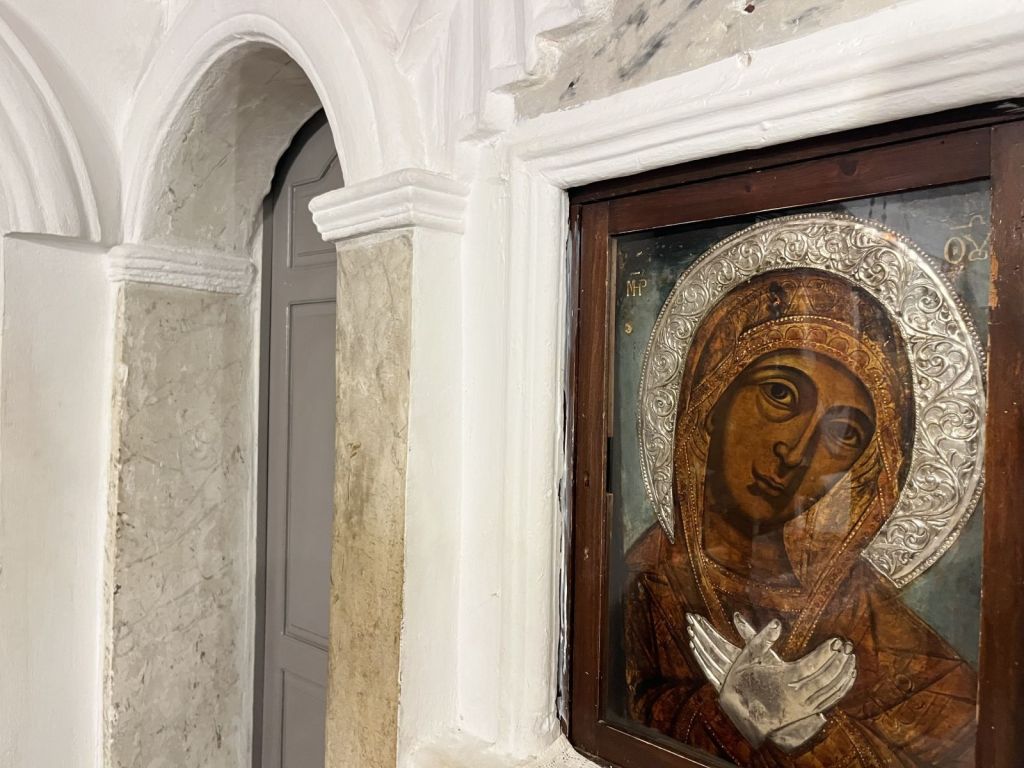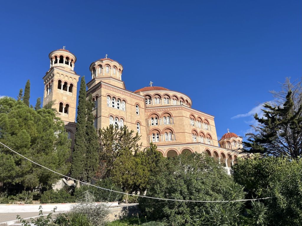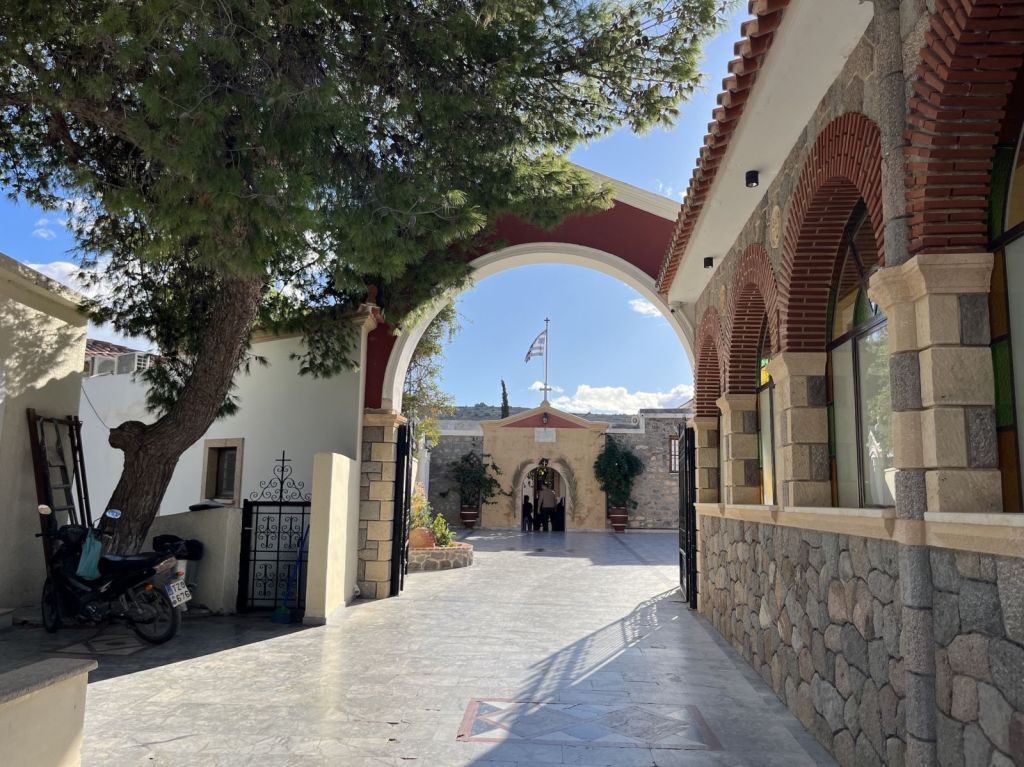 It is a vast and steep complex, with impressive domes, wide staircases and arched colonnades that create a sense of grandeur. At the same time, the inner courtyards, filled with flowers and quiet corners, retain a feeling of peace. Inside the main church, pilgrims light candles and pray before icons and relics of Saint Nektarios.