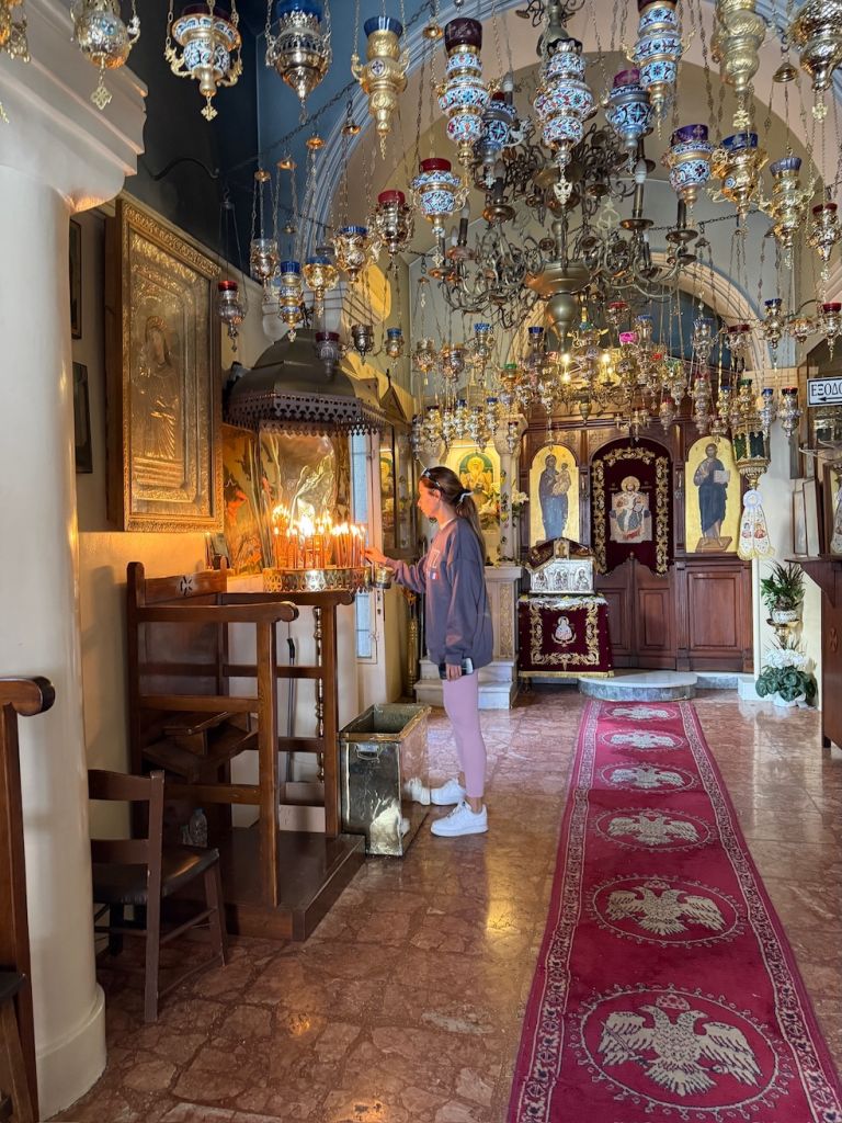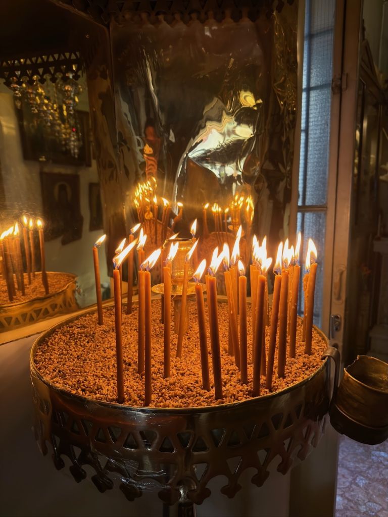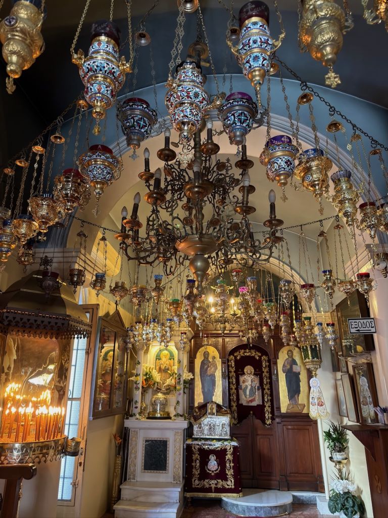 A knowledgeable guardian gives thoughtful explanations and insights – sadly only for Greek speakers, but pretend you can understand. It gives him great joy and then you can drop some euros into the collection box and light a few candles for your loved ones.
